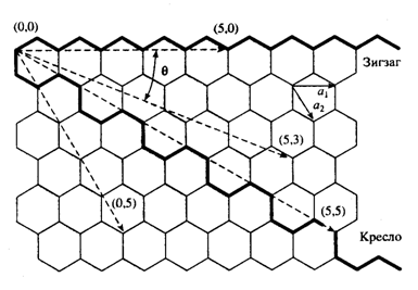 Углеродные нанотрубки (НТ) впервые были обнаружены в продуктах электродугового испарения графита в 1991 году [35]. Однослойные нанотрубки (ОНТ) имеют в качестве основного элемента свернутый в цилиндр графеновый лист [36-40]. Графеновый лист - это лист графита моноатомной толщины. ОНТ различаются не только по диаметру, но и по расположению шестиугольников. Для описания геометрической структуры ОНТ обычно пользуются двумя индексами – m и n, которые определяются лентой, “вырезаемой” из графенового листа перед сворачиванием; m и n являются коэффициентами разложения по базисным векторам a1 и a2 (рис. 1.7) отрезка, соединяющего два атома, находящихся на противоположных сторонах ленты. При сворачивании эти два атома "сливаются". Если при сворачивании графеновой ленты каждая пара сторон шестиугольников расположена к оси трубки под углом, отличным от 0 и 90о, такие ОНТ называются хиральными. Если две стороны каждого шестиугольника перпендикулярны оси трубки, такие трубки называются ахиральными типа “кресла”. У ахиральных трубок типа “зигзаг” две стороны каждого шестиугольника параллельны оси трубки. Для ахиральных трубок типа “зигзаг” значение m или n равно нулю, а для трубок типа “кресла” m = n. В случае m ¹ n мы имеем дело с хиральными трубками.