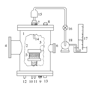 Рис. 2.11. Камера для синтеза фуллеренов методом сжигания углеводо-родов: 1 - камера низкого давления; 2 - медная пластина; 3 - водоохлаждаемый змеевик; 4, 5, 6 - смотровые окна; 7, 8, 9, - питатели горючей смесью; 10 - трубопровод гашения пламени; 11 - трубопровод питания сердцевины пламени; 12, 13 - отсасывающие трубопроводы; 14 - пробоотборник; 15 - фильтр; 16 - вентиль; 17 - расходомер газа; 18 - вакуумный насос.