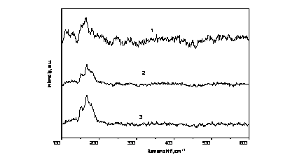 Рис. 3.14. Спектры КР порошка, полученного при распылении электрода с катализатором в области «дыхательной моды»: 1 - до очистки; 2, 3 - после первого и второго этапов очистки.