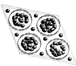 Для объяснения процесса поглощения водорода пучками углеродных НТ предложена модель, согласно которой водород рассматривается как сжимаемая жидкость, способная полностью заполнить свободное пространство внутри НТ. Использование значений плотности 0.071 г/см3 для жидкого водорода и 2.26 г/см3 для графита приводит к величине адсорбции Н2 внутри НТ, равной 2.3 % (мас.). Согласно другой модели, учитывающей адсорбцию молекул водорода с газокинетическим диаметром 0.289 нм как во внутренней полости НТ, так и в межтрубном пространстве жгутов из НТ (рис. 4.8), общая адсорбция Н2 для пучка из (10,10) НТ (D=1.38 нм) составляет