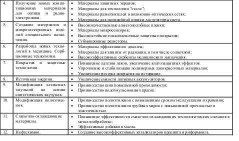 Очевидно, что в настоящей книге, достаточно небольшой по объему, невозможно было осветить все многогранные материаловедческие проблемы, связанные с фуллеренами и углеродными нанотрубками. В заключение хотелось бы указать на те возможные направления использования углеродных наноматериалов, которые лежат вне уже затронутых проблем, но являются чрезвычайно многообещающими и в настоящее время довольно интенсивно изучаются. Особенно интересны водорастворимые производные фуллеренов, применение которых в биологии и медицине может привести, по образному выражению академика РАН Ю.А. Осипьяна, к “революционным последствиям” [1]. Большое будущее ожидает фуллерены и в качестве нового класса полупроводниковых материалов. Работы в этом направлении уже позволили создать сверхпроводящие (Тс=52 К), дырочно-легированные структуры, напоминающие полевой транзистор [2]. Как считают специалисты фирмы "Приморье" из Санкт-Петербурга, возможных областей применения фуллеренов может быть множество. Их прогнозы помещены в таблице 1.