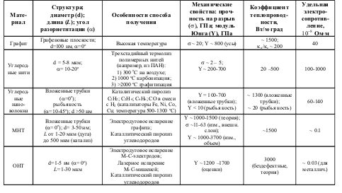 Таблица 2. Некоторые свойства углеродных наноматериалов.