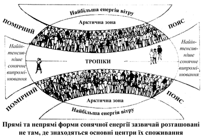 У сонячної енергії є ще один недолік, який ми вже відзначали, – загалом її пряма і непряма дія сконцентрована в областях, далеких від центрів її споживання. Більше всього енергії сонячних променів надходить у тропіках і субтропіках, проте основні споживачі зосереджені в помірних широтах. Енергія вітру найбільша в полярних регіонах і не настільки велика в помірних широтах. Те ж саме можна стверджувати й про гідроенергію, термальну енергію океанів, енергію хвиль, течій і припливів – здебільшого вона найменш доступна в тих районах, де найбільш потрібна.