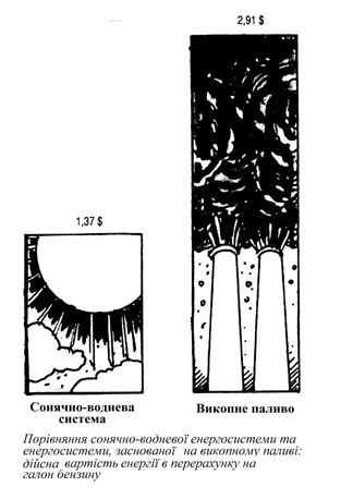 Якщо ми будемо вимірювати його галонами або літрами, як ми це робимо зі звичайним пальним, тоді водень, отриманий з використанням гідроелектроенергії, виявиться найдешевшим із усіх палив, зрозуміло, з урахуванням усіх витрат і високої ефективності водню як палива – 1,05 дол. за умовний галон палива (еквівалент галона бензину в цінах 1990 р.). Синтетичний газ виявиться більш ніж у 2 рази дорожчим – 2,39 дол., причому його ціна також перевершує (майже на 70 %) і вартість водню (1,41 дол. за галон), отриманого з використанням прямих і непрямих форм сонячної енергії, відмінних від гідроелектроенергії. Якщо розглянути рідкі палива, то водень від гідростанцій буде найдешевший – 1,31 дол., за ним іде водень з інших джерел сонячної енергії – 1,75 дол. Синтетичне паливо найдорожче – 3,43 дол., тобто в 2-2,5 рази дорожче за водень.