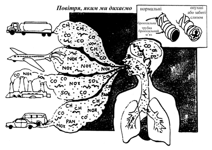 На відміну від СО2, NOx «атакує» нас безпосередньо. У легенях, коли ми вдихаємо забруднене повітря, він перетворю-ється у кислоту. NOx потроху пожирає губчату тканину легень, зменшуючи тим самим їхній об’єм, і, таким чином, усе менше і менше кисню потрапляє в нашу кров. Зрештою це може призвести до смерті, але спочатку людина починає відчувати кисневу недо¬статність і страждає від хронічних легеневих і бронхіальних захво¬рювань, таких як емфізема. Наприклад, у повітряному басейні пів¬денного узбережжя США недалеко від Лос-Анджелеса найголовнішу загрозу людському здоров’ю складають саме NOx і РАN, у складі яких присутні кислоти. Це компоненти бензину і аж ніяк не СО2.
