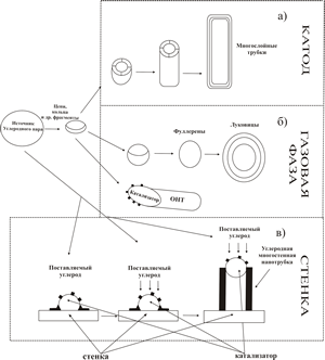 Путь, который проходят атомы углерода с момента ионизации на поверхности анода и до участия в фуллереновой молекуле, находящейся в составе фуллеренсодержащей сажи на стенке реактора, недостаточно ясен и понятен, несмотря на значительное количество публикаций по этой проблеме.