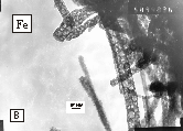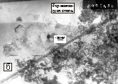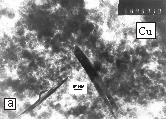 Наноструктуры, полученные при взаемодействии углеродного пара с металическими поверхностями (ПЕМ): а - на медной подложке; б - на подложке из нержавеющей стали; в - на железной подложке