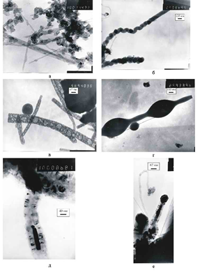 Все эти наноразмерные составляющие могут отличаться геометрией строения. Они могут быть вьющимися, прямыми (а), спиралевидными (б), кристаллонаполненными (в), бамбукообразными (г), кристаллическими (д, е); несодержащими (а, б, в, г) и содержащими (д, е) в своем объеме метал; с концом трубки открытым (д) и закрытым (е) катализатором.