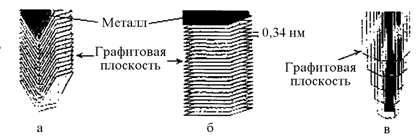 Графитовые нановолокна (ГНВ) могут состоять из плоско-параллельных графеновых пластинок, перпендикулярных оси волокна (platelet-type GNF) (рис. 1.9, б), из длинной стопки графеновых конусов (herring-bone GNF) (рис. 1.9, а) или усеченных конусов (conical layer nanotubes, CLNT) (рис. 1.9, в).