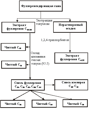 Анализ имеющихся в литературе сведений позволяет полагать, что в настоящее время наиболее оптимальным вариантом по производительности, чистоте получаемых продуктов, минимуму потерь фуллеренов, доступности носителя и элюентов, простоте технологической цепочки является схема разделения и экстракции фуллеренов, представленная на рис. 2.12.