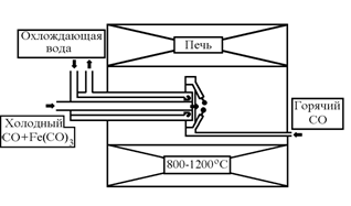 В конце 2000 года на одном из совещаний по нанотехнологии Р.Смолли из Rice University (Хьюстон, США) заявил, что по разработанной ими технологии можно получить килограммы одностенных нанотрубок [57]. Основы этого процесса описаны в [58]. Поток СО с небольшим количеством Fe(CO)5 под давлением 1-10 атм пропускается через нагретый до 800-1200 °С реактор (рис. 3.8). Кластеры железа, являющиеся катализаторами и центрами роста одностенных нанотрубок, образуются при термическом разложении карбонила железа Fe(CO)5 в нагретом потоке СО. Считается, что процесс можно проводить непрерывно, а выход и диаметр нанотрубок можно изменять варьированием параметров. Авторами были получены одностенные нанотрубки с разными диаметрами, в том числе - диаметром всего 0,7 нм. Отмечается, что выход максимален при 1200 °С и 10 атм. Р. Смолли считает, что процесс можно и нужно масшта-бировать и с этой целью им создана новая фирма - Carbon Nanotechnologies Inc.