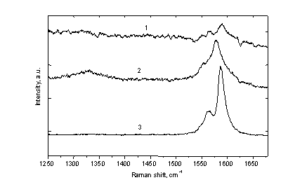 Рис. 3.13. Спектры КР порошка, полученного при распылении электрода с катализатором: 1 - до очистки; 2, 3 - после первого и второго этапов очистки.