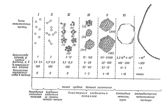Наиболее изучена химия металлических кластеров, допускающих прямое взаимодействие металл - металл. На рис. 5.1 приводится иерархическая лестница перехода от отдельных атомов через кластеры к металлическим частицам и, далее, к массивным образцам. Как видно из рис. 5.1, размером кластеров принято считать размер частиц в интервале 6-100 Å. Свыше 100 Å  это уже коллоидные частицы. Более 300 Å  это ультрадисперсные порошки. Путем агрегации таких порошков образуются компактные металлы. Указанные цифры условны и зависят от размера атомов, их электронного строения, температуры, давления, растворителя, если кластеры образуются в растворе, и т. д. На рисунке также указано количество атомов, содержащихся в каждом типе частиц.