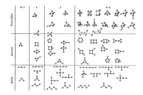 Структура остова в кластерах может быть построена из цепей различной длины и разветвленности, циклов, полиэдров, она может быть каркасной, а также представлять собой комбинации из перечисленных структурных элементов. На рис. 5.2 приводятся цепи, циклы и полиэдры для кластеров, содержащих 3-6 атомов. Геометрические особенности соединения атомов в плоскости или пространстве обусловливают явление изомерии. При увеличении количества атомов в остове кластера (нуклеарности) количество способов их соединения растет.