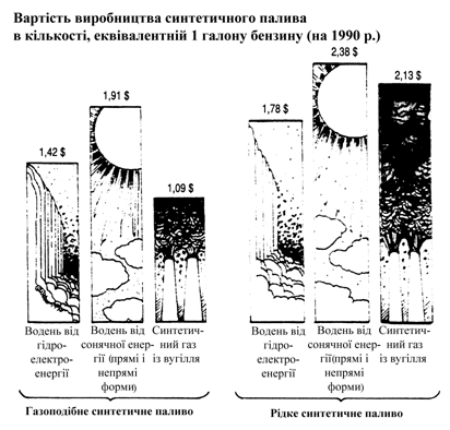 Серед усіх синтезованих газів синтетичний природний газ найдешевший, у той час як серед синтезованих рідин найменша вартість у зрідженого водню, отриманого на гідроелектростанціях (як ви пам’ятаєте, рідкий водень – краще паливо для ракет і високо¬швидкісних реактивних двигунів). Дивлячись на діаграму, легко зрозуміти, яке паливо найдешевше, однак не варто забувати, що це тільки вартість виробництва. Потрібно пам’ятати, що викопне пали¬во, навіть синтетичне, несе у собі приховані екологічні витрати. Як¬що ми їх додамо, наскільки високо піднімуться відповідні рівні цін?