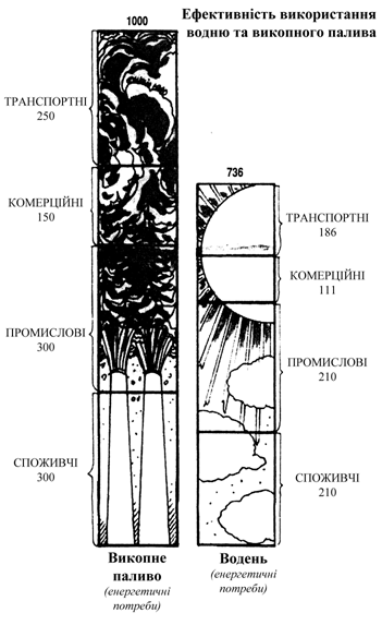 У той же час водень, отриманий при використанні як прямих, так і непрямих форм сонячної енергії, не завдає ніяких екологічних збитків. Так що немає і додаткових витрат при застосуванні саме енергії Сонця та енергетичного посередника – водню. Звичайно, варто ще врахувати і той факт, що водень більш ефективний як паливо і у газоподібному стані і у вигляді рідини. Іншими словами, щоб виконати таку ж роботу за допомогою водню, палива нам знадобиться на 26 % менше.