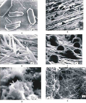 Все эти наноразмерные составляющие могут отличаться геометрией строения. Они могут быть вьющимися, прямыми (а), спиралевидными (б), кристаллонаполненными (в), бамбукообразными (г), кристаллическими (д, е); несодержащими (а, б, в, г) и содержащими (д, е) в своем объеме метал; с концом трубки открытым (д) и закрытым (е) катализатором.