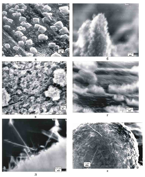 Эмитирующие центры на поверхности подложки могут иметь различную геометрическую форму (а,б - форму правильных кристаллов, в - игольчатую форму; г - сферическую и т.д.). Они могут располагаться на поверхности в виде пучков углеродных нанотрубок (е) и в виде конгломератов кристаллов (д), могут быть сориентированы под различными углами к поверхности (а, б, в).