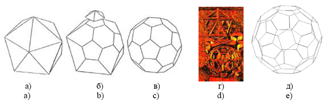Fig.1. a) Icosahedron formed by 20 equilateral triangles, b) diagram of "truncation" process, c) truncated icosahedron, d) fragment of the picture (1480) of the famous Italian mathematician and painter, Pietro della Francheska, e) the most stable structure of C60 with double bonds connecting pentagons from single bonds.