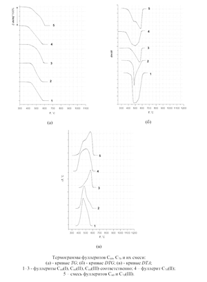 Различные температуры скоростей взаимодействия фуллеритов с кислородом воздуха при нагреве могут зависеть от их степени полимеризации, примесей, степени кристалличности и дисперсности, а также от природы и структуры самих фуллереновых молекул (т.е. от количества атомов углерода, их образующих). Для углеродных волокон условия их взаимодействия с кислородом воздуха во многом зависят от наличия различных углеродных фаз, присутствия различных примесных функциональных групп и степени графитизации продукта. Исследование влияния степени графитизации продукта пиролиза ацетилена, полученного при 500С на Ni катализаторе, показало, что только после отжига в среде гелия при температуре 1400С наблюдается однофазность полученного продукта, который в дальнейшем начинает окисляться при высокой температуре.