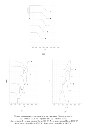 Термогравиметрические исследова-ния и дифференциальнотермический анализ различных углеродных материалов - сажи, графита, фуллеренов, нанотрубок и их смесей известного состава, выполненные на приборе Дериватограф Q-1500D в условиях динамического нагрева от комнатной температуры до 1400С на воздухе, установление температурного интервала их взаимодействия с воздухом и температуры максимальной скорости убыли массы оказались полезными при исследовании состава наноструктурных углеродных материалов, полученных различными методами, в различных температурных режимах, с использованием в качестве катализаторов различных металлов. Полученные результаты оказываются ценными при подборе технологических условий синтеза подобных материалов.