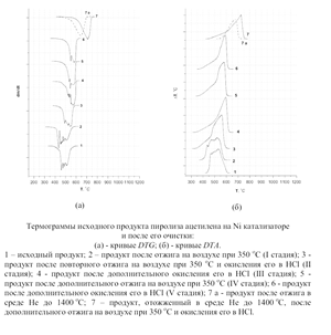 Дериватографические исследования термического разложения дисперсных частиц различных металлоуглеродных композитов, полученных в различных средах, позволили наметить пути дальнейших исследований в направлении создания металл-углеродных водо- родсорбирующих материалов с повышенной циклической устойчивостью. Термогравиметрический метод был применен для оценки степени очистки от металла и аморфного углерода продукта пиролиза ацетилена на Ni-катализаторе путем его многократного отжига на воздухе при 350С и обработки в соляной кислоте. Как следует из рисунка, наиболее эффективная очистка продукта достигается при его предварительном отжиге (не ниже 1400С) в инертной среде.